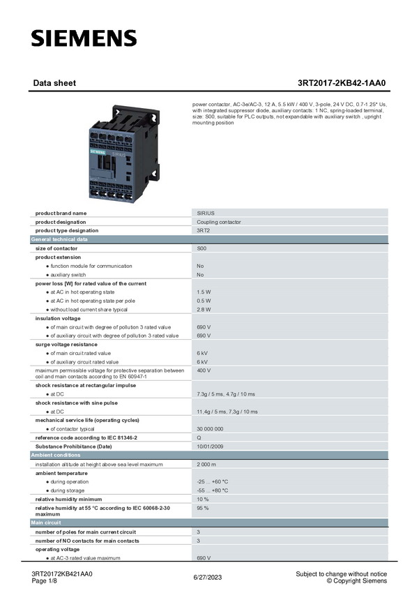 Stycznik Siemens 3RT2017-1AP02-2AA0 3RT20171AP022AA0, 1 szt.