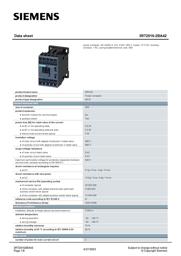 Stycznik Siemens 3RT2016-2BA42 3RT20162BA42, 1 szt.