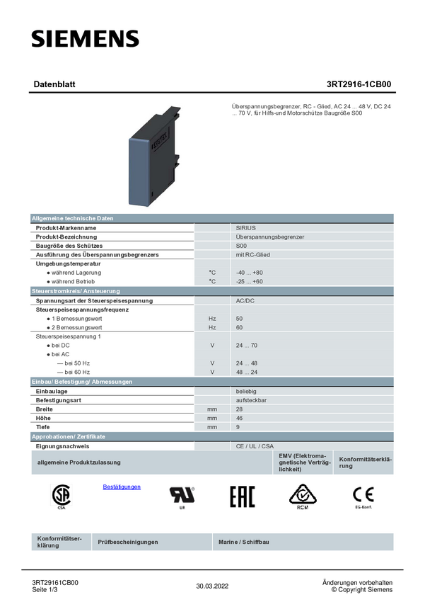 Ochrona przeciwprzepięciowa Siemens 3RT2916-1BE00 warystor 1 szt.