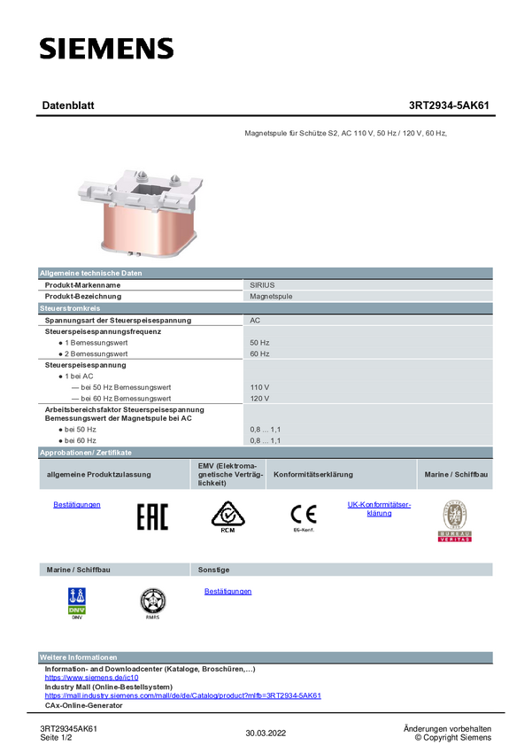 Cewka magnetyczna Siemens 3RT2934-5AH01 3RT29345AH01, 1 szt.