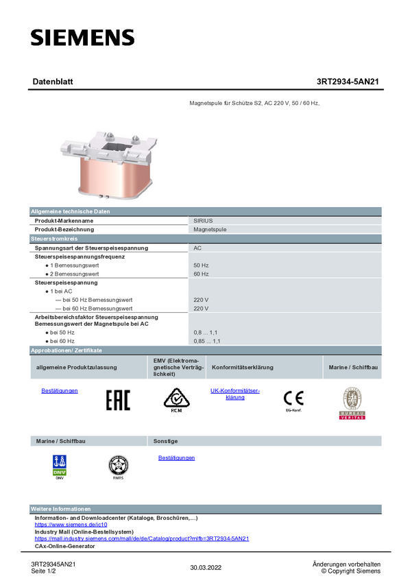 Siemens 3RT2934-5AC21 Cewka magnetyczna 1 szt.