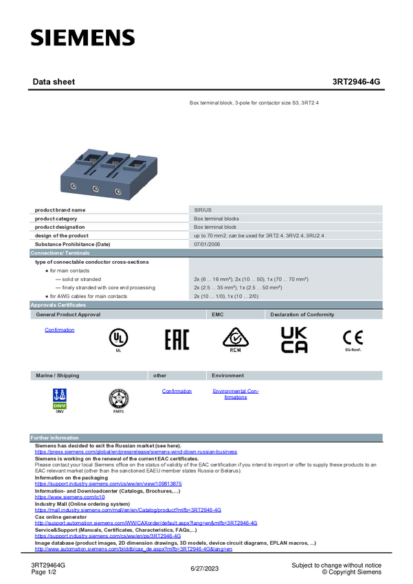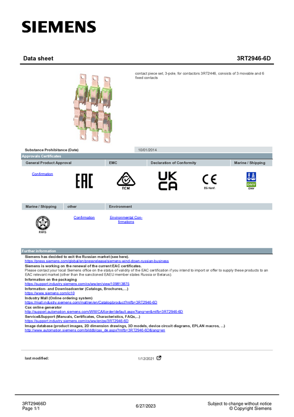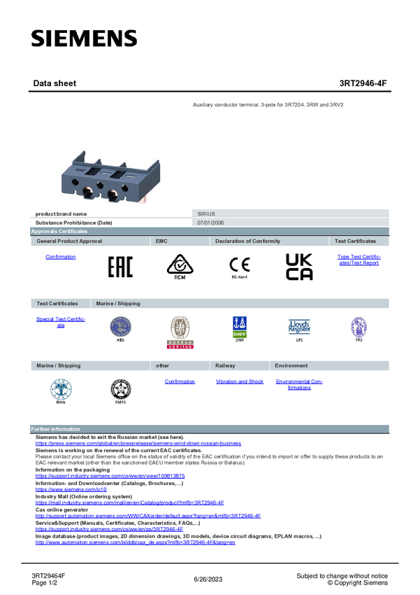 Zestaw akcesoriów Siemens 3RT2946-6D 1 szt.