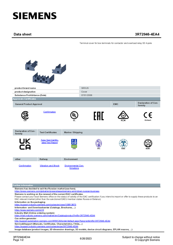 Pokrywa zacisków Siemens 3RT2946-4EA4 1 szt.