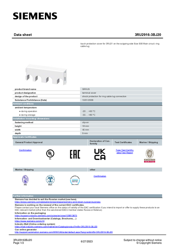 Zaślepka Siemens 3RU2916-3BJ20 10 szt.
