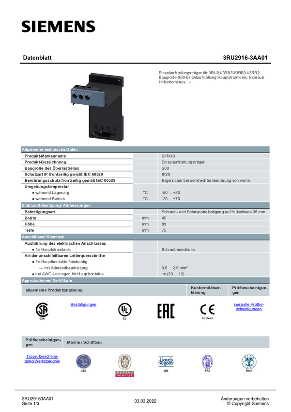 Niezależny wspornik montażowy Siemens 3RU2916-3AA01 1 szt.