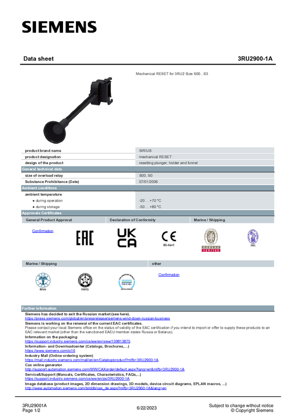 Siemens 3RU29001A 3RU2900-1A Reset mechaniczny 1 szt.