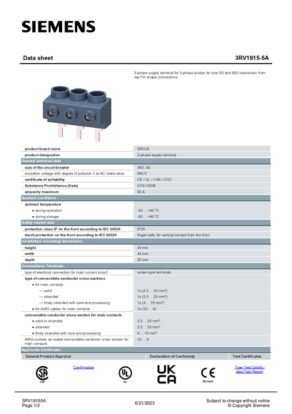 Złącze instalacyjne Siemens 3RV1915-5A 1 szt.