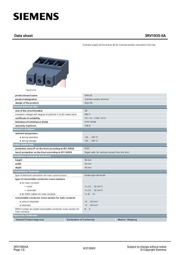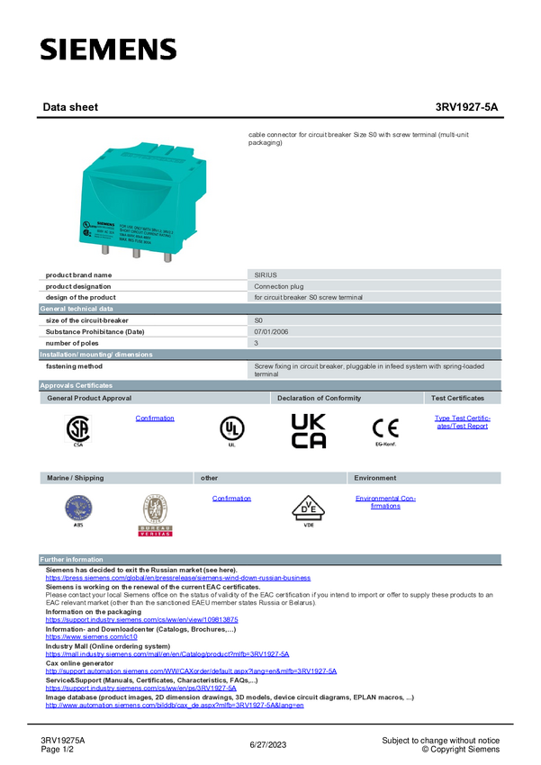 Złącze instalacyjne Siemens 3RV1935-5A 1 szt.