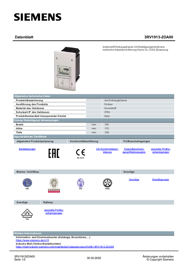 Siemens 3RV19132DA00 Obudowa z tworzywa sztucznego do zabudowy 3RV1913-2DA00, IP55, 105 mm x 175 mm x 108 mm, 1 szt.