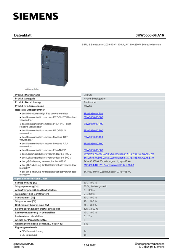 Siemens 3RW5554-6HA16 3RW55546HA16 Soft-start Moc silnika przy 400 V 450 kW Moc silnika przy 230 V 250 kW 200 V, 690 V N
