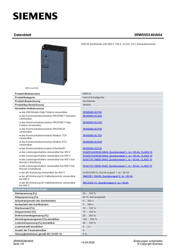 Siemens 3RW5553-6HA14 3RW55536HA14 Soft-start Moc silnika przy 400 V 400 kW Moc silnika przy 230 V 200 kW 200 V, 480 V N