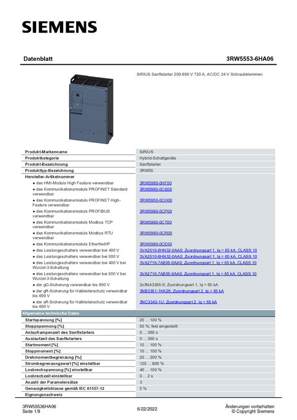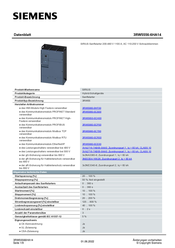 Siemens 3RW5554-6HA06 3RW55546HA06 Soft-start Moc silnika przy 400 V 450 kW Moc silnika przy 230 V 250 kW 200 V, 690 V N