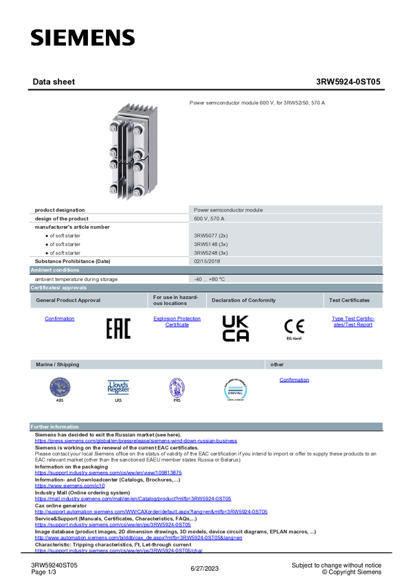 Półprzewodnik mocy Siemens 3RW5924-0ST05 3RW59240ST05