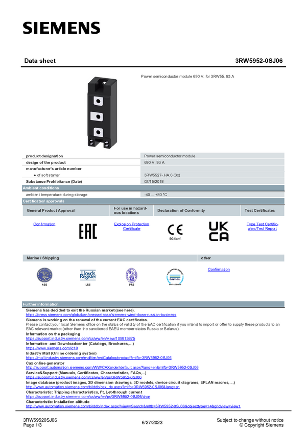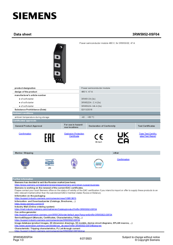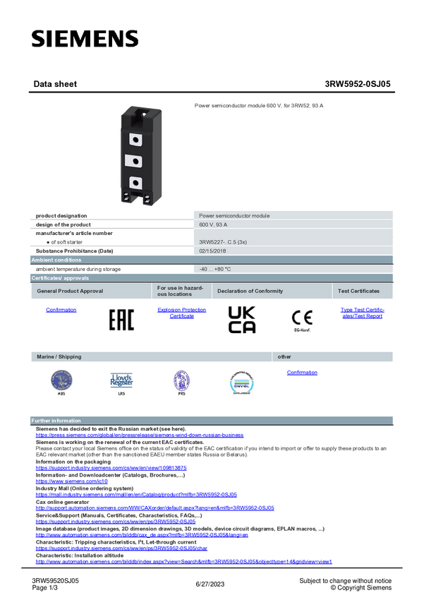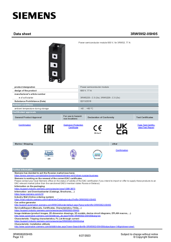 Półprzewodnik mocy Siemens 3RW5952-0SH06 3RW59520SH06
