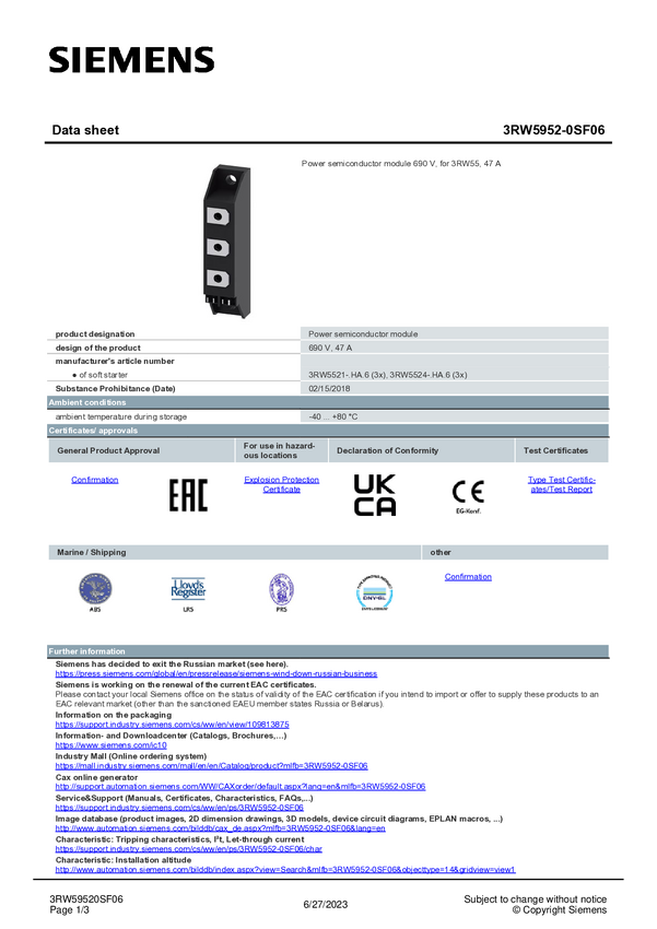 Półprzewodnik mocy Siemens 3RW5952-0SF06 3RW59520SF06