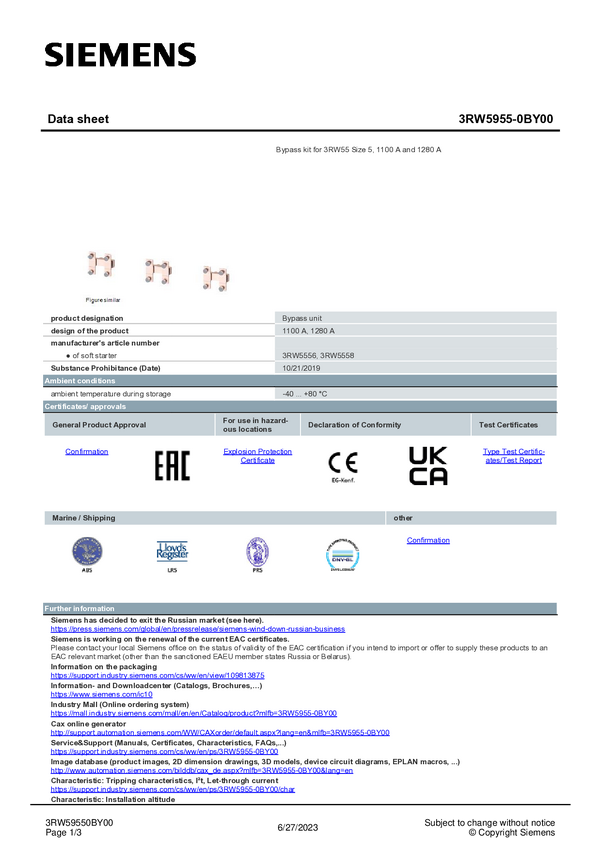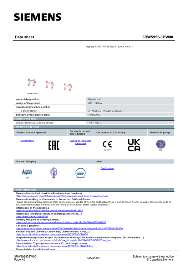 Zestaw Baypass Siemens 3RW5955-0BY00 3RW59550BY00