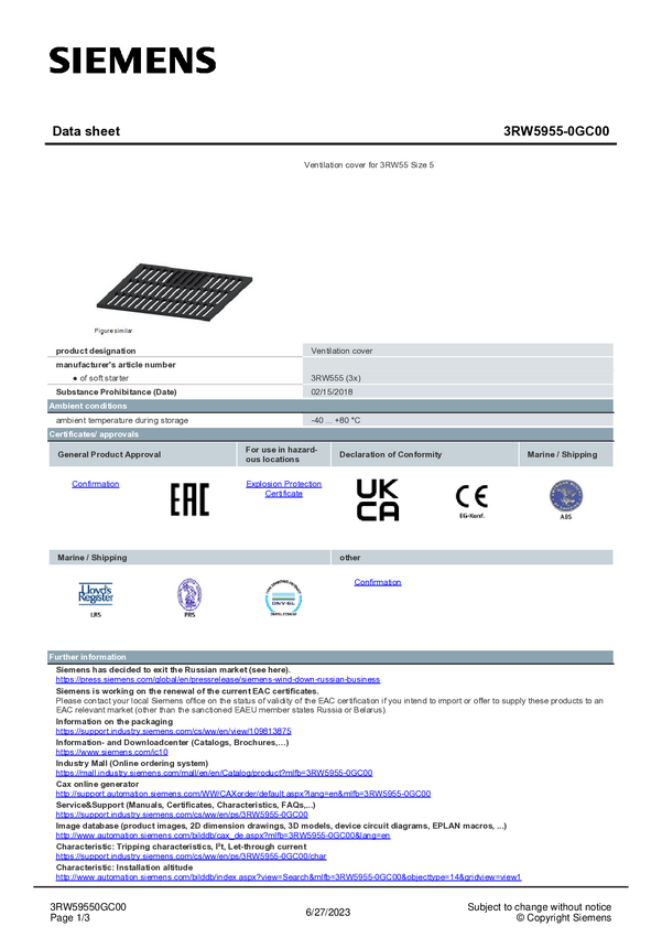 Osłona wentylacyjna Siemens 3RW5955-0GC00 3RW59550GC00