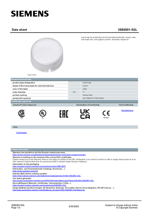 Pokrywka Siemens 3SB2901-7QK 10 szt.