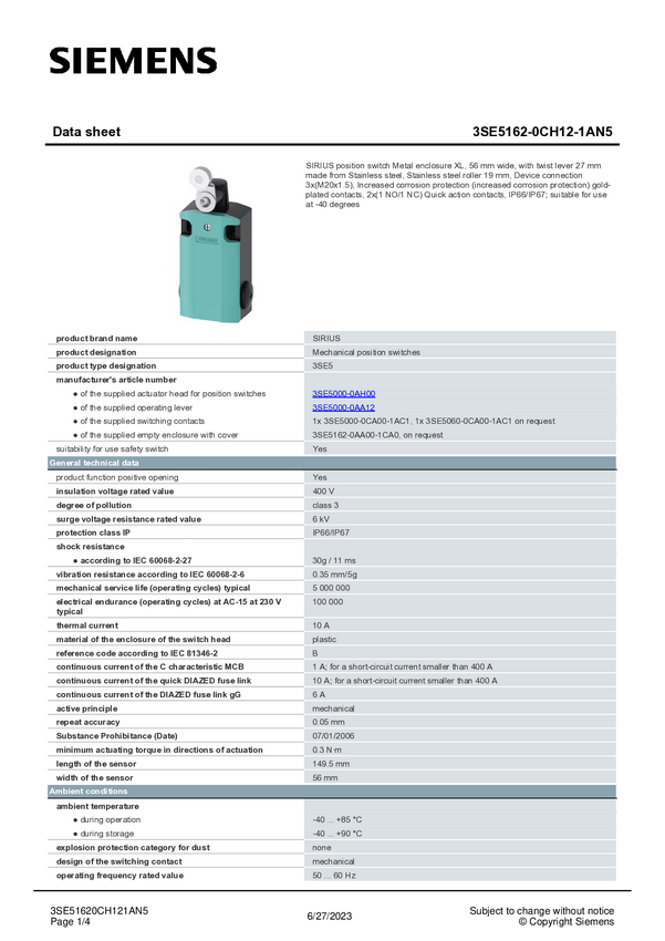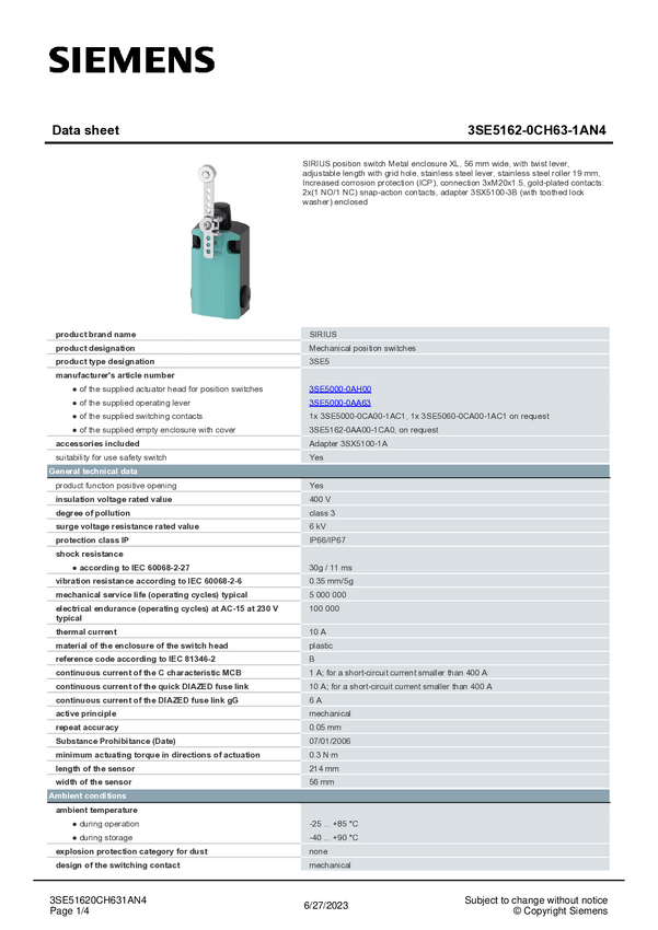 Siemens 3SE51620CH631AN4 3SE5162-0CH63-1AN4 Przełącznik pozycyjny 1 szt.