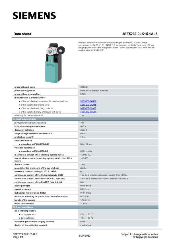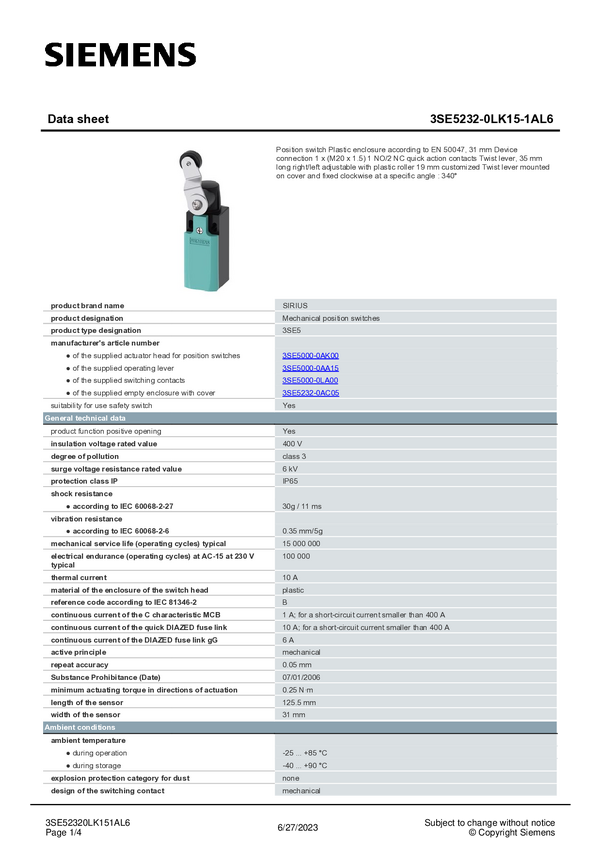 Siemens 3SE52320LK151AL6 3SE5232-0LK15-1AL6 Przełącznik pozycyjny 1 szt.