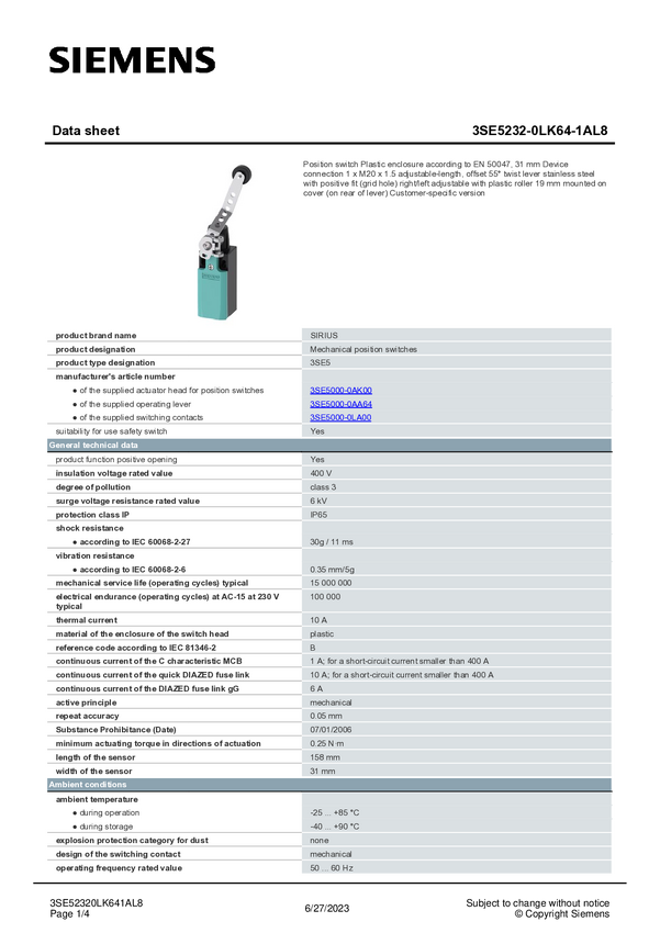 Siemens 3SE52320LK641AL8 Przełącznik pozycyjny 3SE5232-0LK64-1AL8, 1 szt.