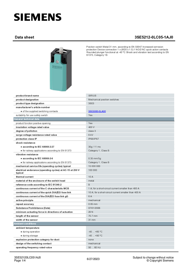 Siemens 3SE52120LC051AJ0 3SE5212-0LC05-1AJ0 Przełącznik pozycyjny 1 szt.
