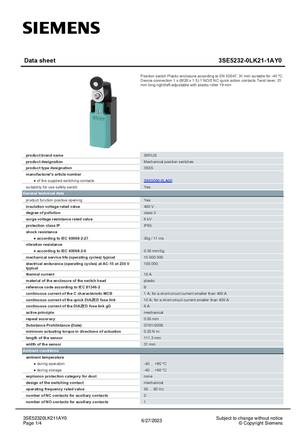Siemens 3SE52320LK211AY0 Przełącznik pozycyjny 3SE5232-0LK21-1AY0, 1 szt.