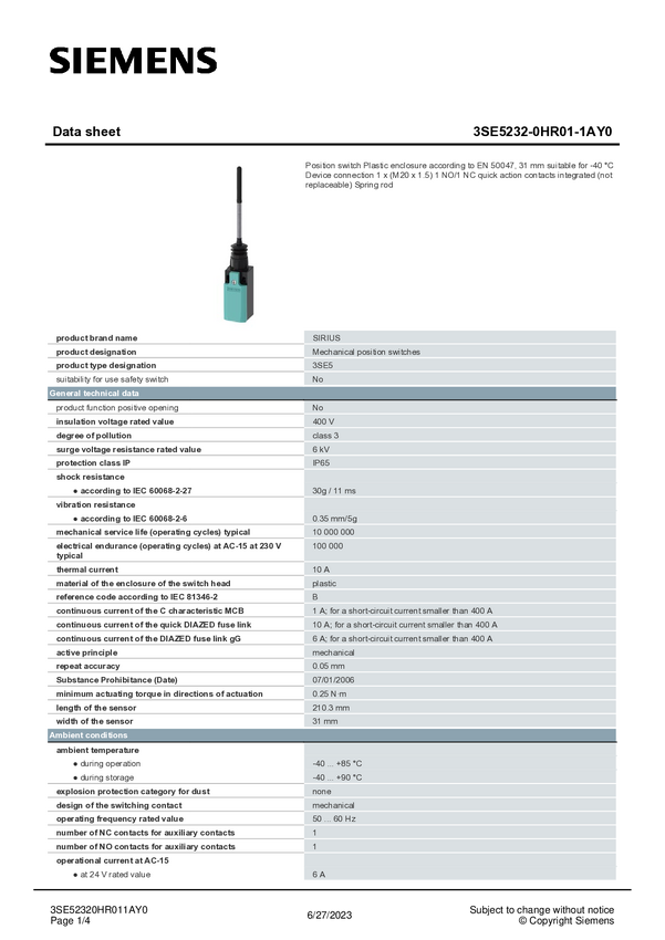 Siemens 3SE52320HR011AY0 3SE5232-0HR01-1AY0 Przełącznik pozycyjny 1 szt.