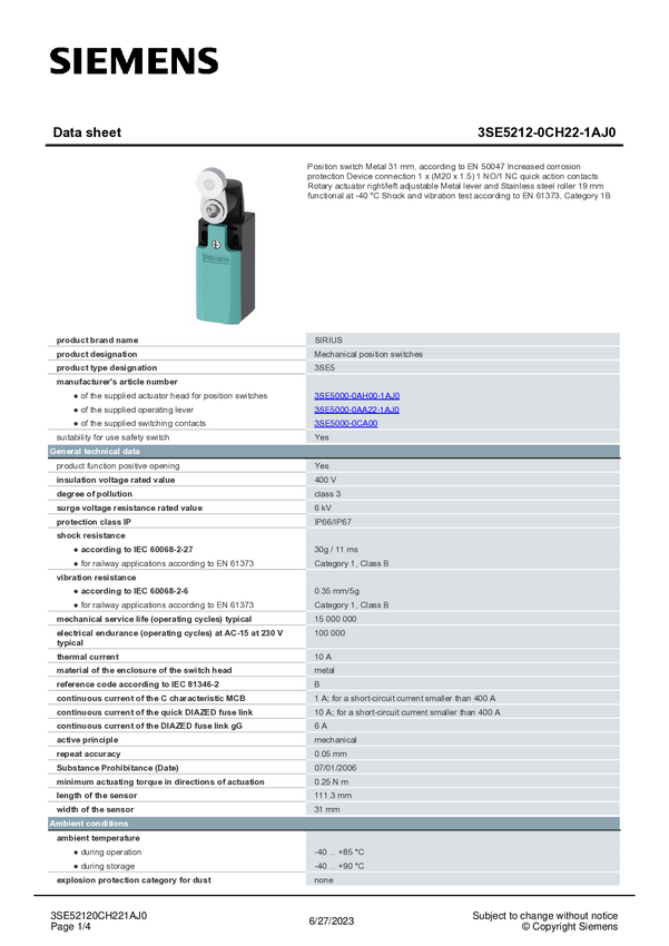 Siemens 3SE52340CD031AJ1 Przełącznik pozycyjny 3SE5234-0CD03-1AJ1, 1 szt.