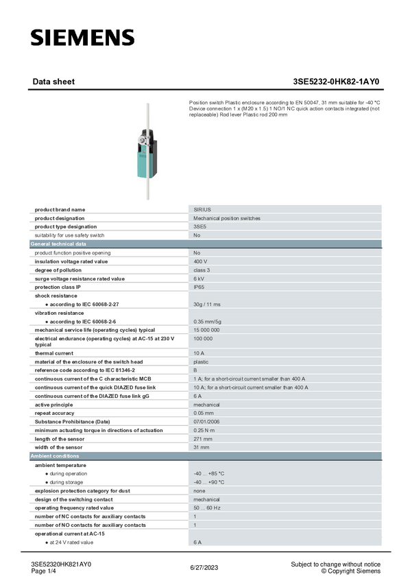 Siemens 3SE52320HK821AY0 Przełącznik pozycyjny 3SE5232-0HK82-1AY0, 1 szt.