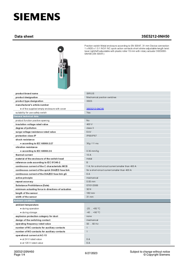 Siemens 3SE52120NH50 Przełącznik pozycyjny 3SE5212-0NH50, 1 szt.