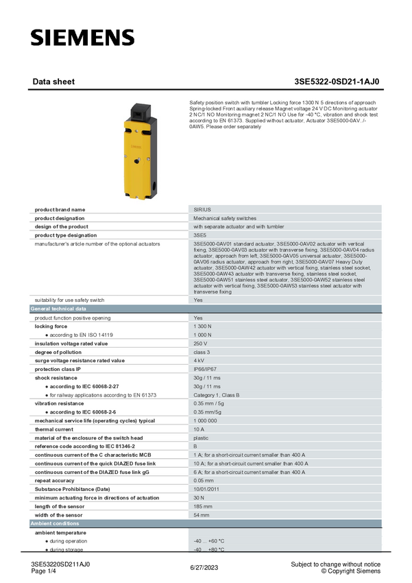 Siemens 3SE53220SD211AJ0 Przełącznik pozycyjny bezpiecznikowy 3SE5322-0SD21-1AJ0, 1 szt.