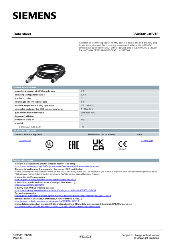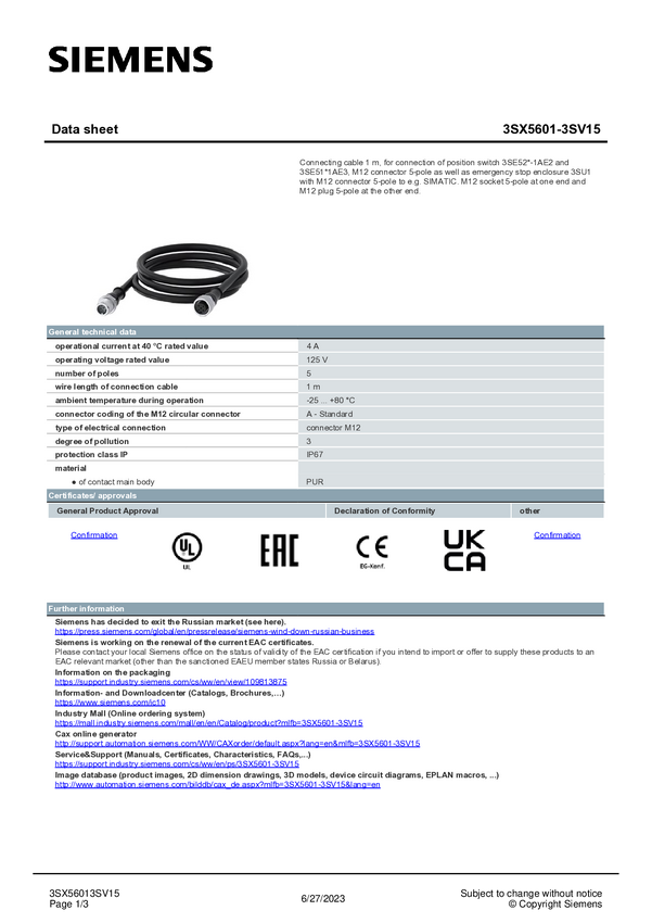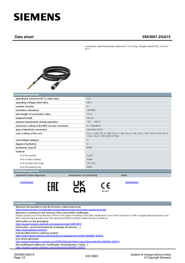 Siemens 3SX56012GA15 Przewód przyłączeniowy 3SX5601-2GA15, 1 szt.