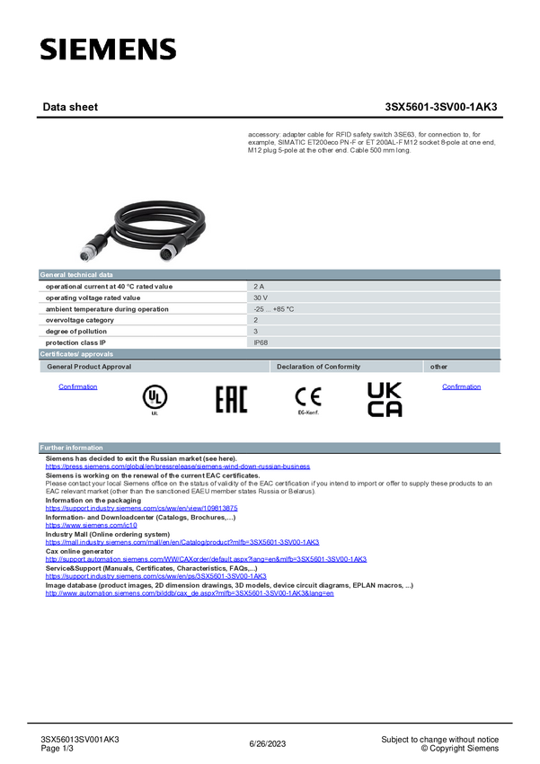 Siemens 3SX56013SV001AK3 3SX5601-3SV00-1AK3 Kabel adaptera 1 szt.