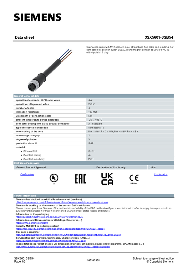 Siemens 3SX56013SB54 Przewód przyłączeniowy 3SX5601-3SB54, 1 szt.