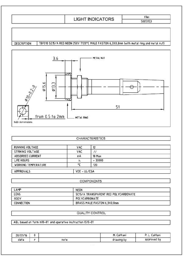 Kontrolka; TBF010 SC15/A green; 10mm; podświetlenie neonówka 250V; zielony; konektory 6,3x0,8mm; srebrny; IP67; 51mm; RoHS