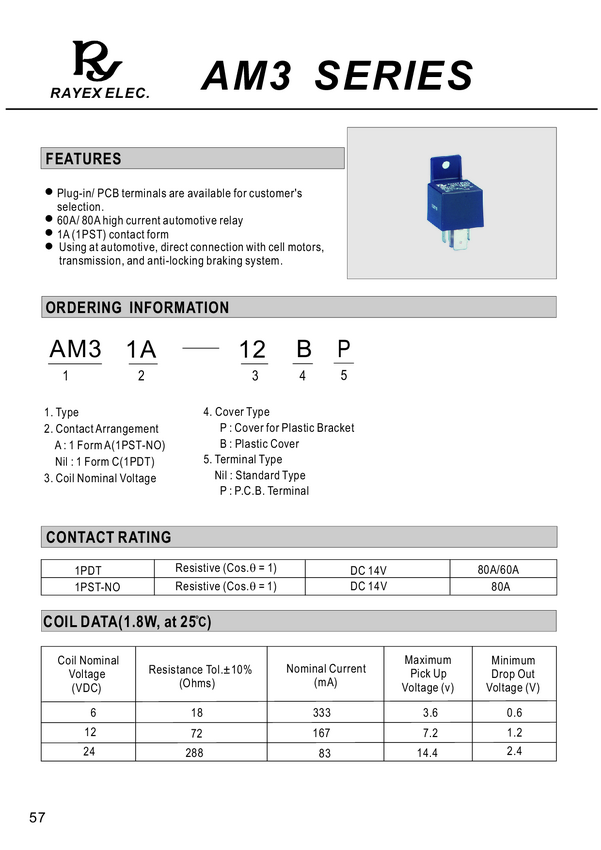 Przekaźnik; elektromagnetyczny; samochodowy; 12V DC; 80A; 1,8W; SPDT 1 styk przełączny; konektory 6,3x0,8mm, konektory 9,5x1,2mm RAYEX; AM3-12P; AM3-12CF; RoHS