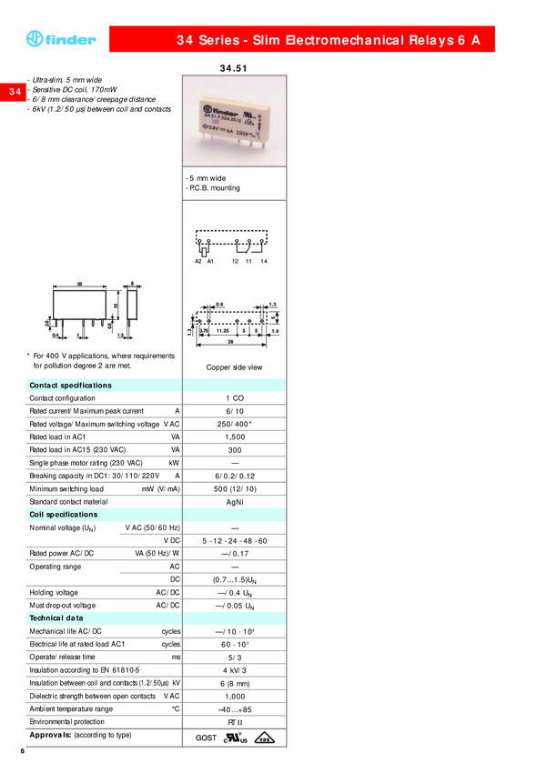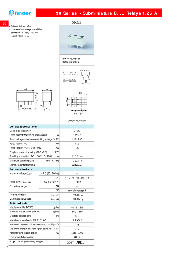 Przekaźnik FINDER PCB, DPDT, prąd znamion 2A, seria 30.22, obudowa 20,3x10,4x11,4mm / 1,25A 5V 125R