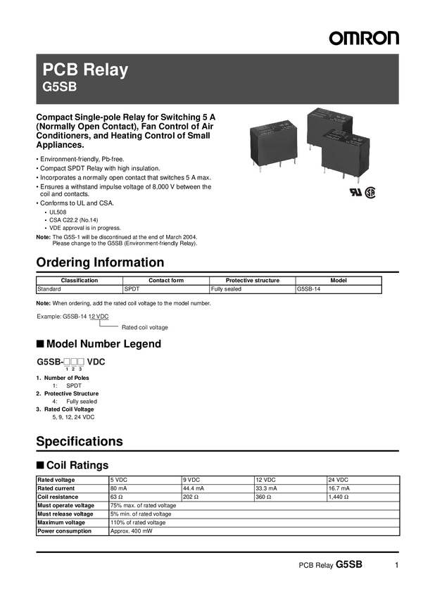 Przekaźnik OMRON PCB; SPDT; prąd znamion 5A, seria G5SB14 obudowa 20,3x10,3x15,8mm; 5V 63R