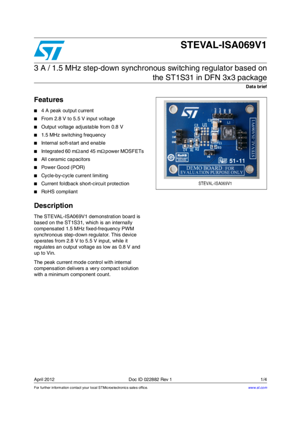3 A / 1.5 MHz step-down synchronous switching regulator based on the ST1S31 in DFN 3x3 package