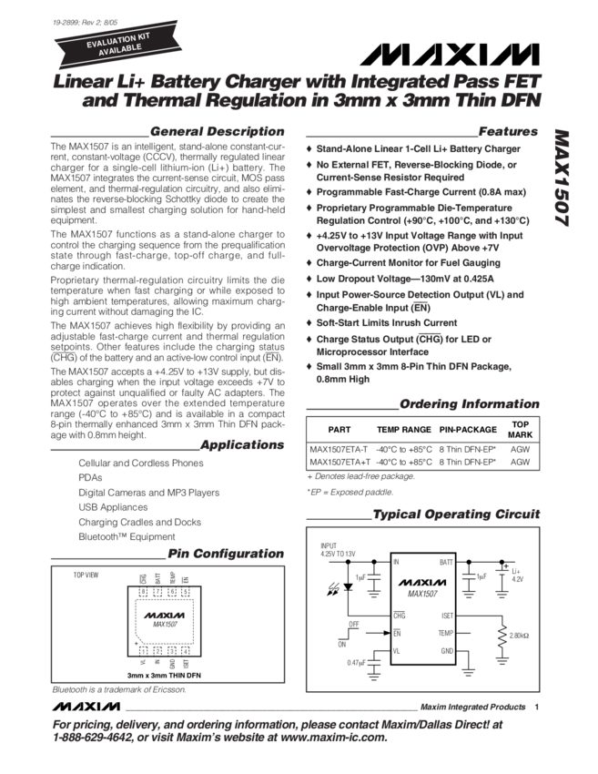 MAX1507 Linear Li+Battery Charger with Integrated FET and Programmable Thermal Regulation in 3x3mm, Thin DFN