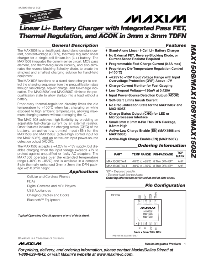 MAX1508 Linear Li+ Battery Charger with Integrated Pass FET, Thermal Regulation, and AC OK Flag in 3x3mm Thin DFN