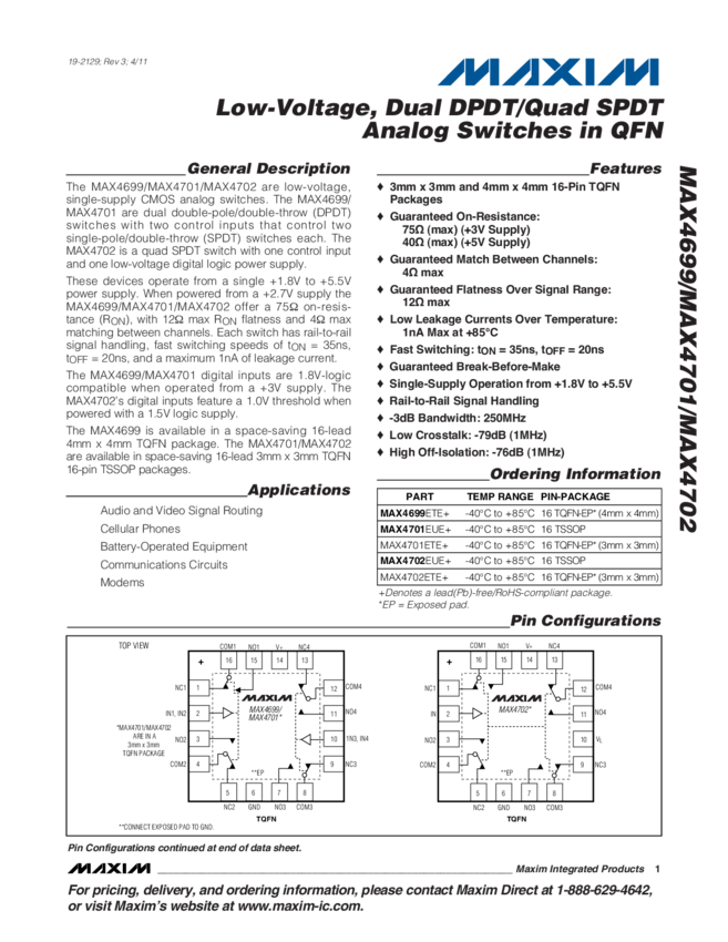 MAX4702 Low-Voltage, Quad SPDT Analog Switch in 3x3 QFN