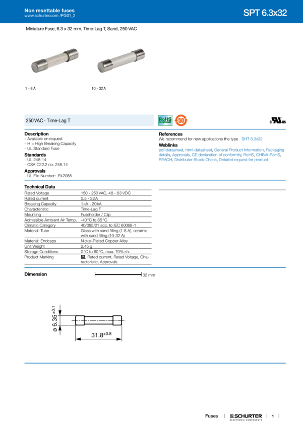 FUSE, Cartridge, Non-resettable, Slow Blow, High Breaking Capacity, SP ø6.3x32mm, 250Vac, 1.0A, Box 10 pcs