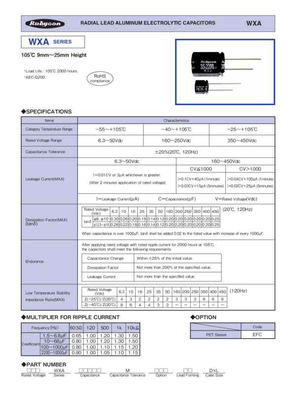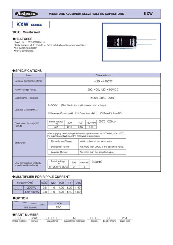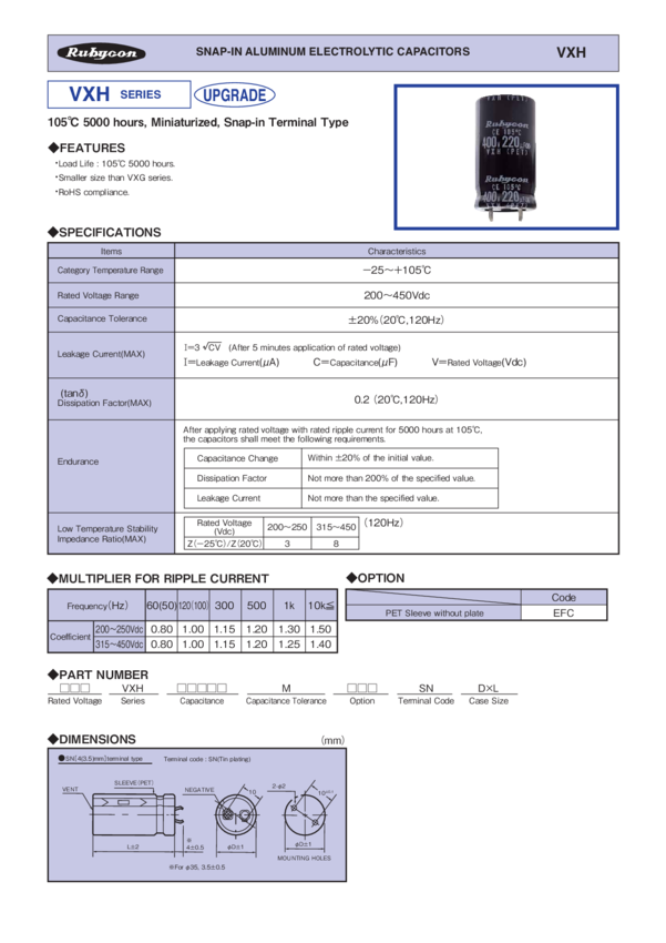 CAPACITOR, Aluminum Electrolytic, Snap In, VXG Series, Cylindrical Can, 100Vdc, 1000µF, ±20%, PET Sleeve, ø25x30mm long