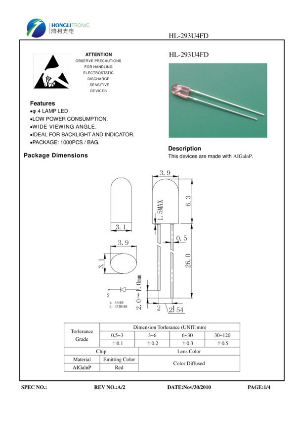 Dioda LED, owalna 3mm, , 625 nm, super-jasna 400mCd, dyfuzyjna, 100/60 stopni, Honglitronic