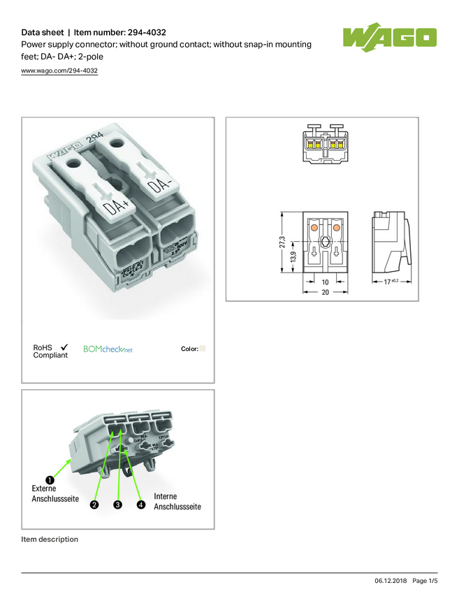 Złącze zasilające stała: 0.5-1.5 mm² Ilość styków: 2 WAGO WAGO GmbH & Co. KG 1000 szt. biały