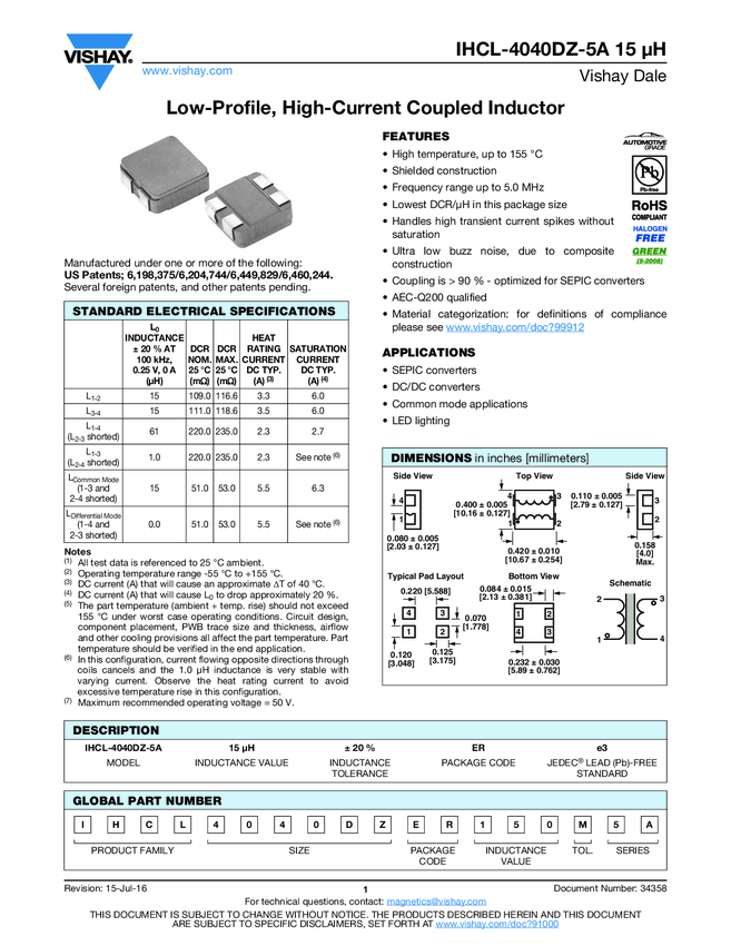 Ind High Current Shielded 15uH 20% 100KHz 3.3A 4040 T/R