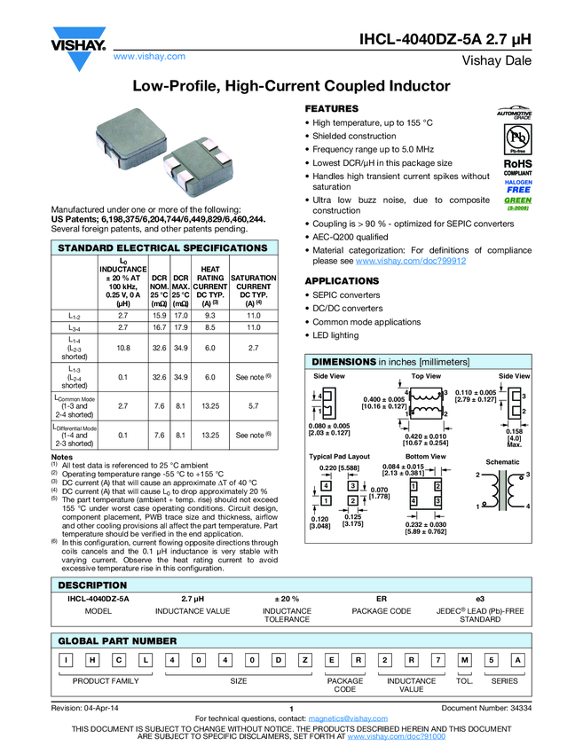 Ind High Current Shielded 2.7uH 20% 100KHz 9.3A 4040 T/R