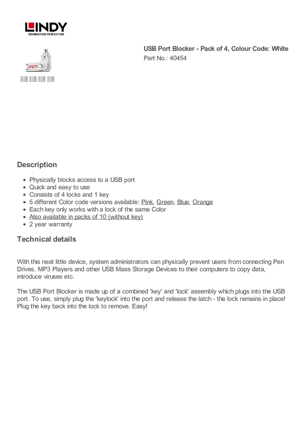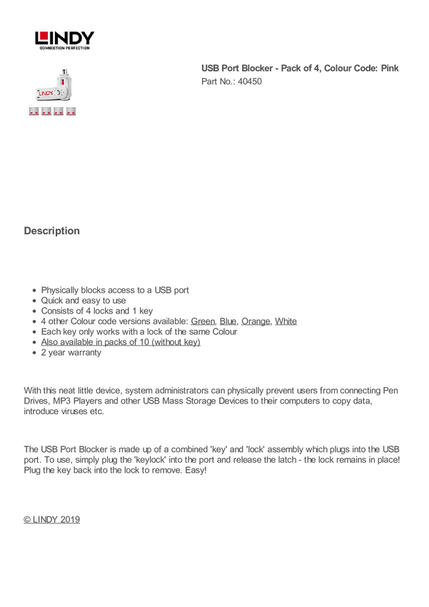 Blokada portu USB LINDY Blokada portu USB USB-Lock + Key różowy zaw. 1 klucz